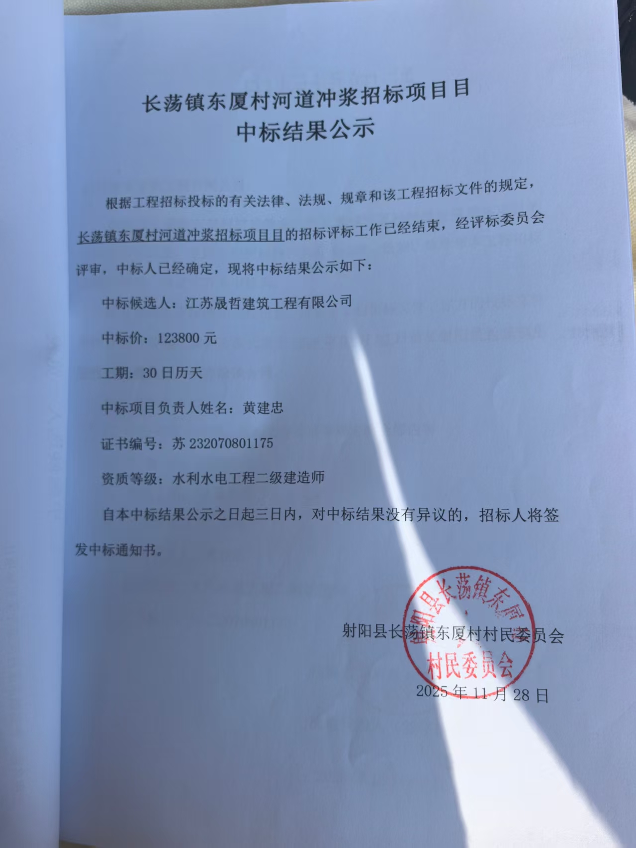 长荡镇东厦村河道冲浆招标项目目中标结果公示